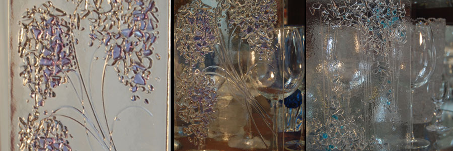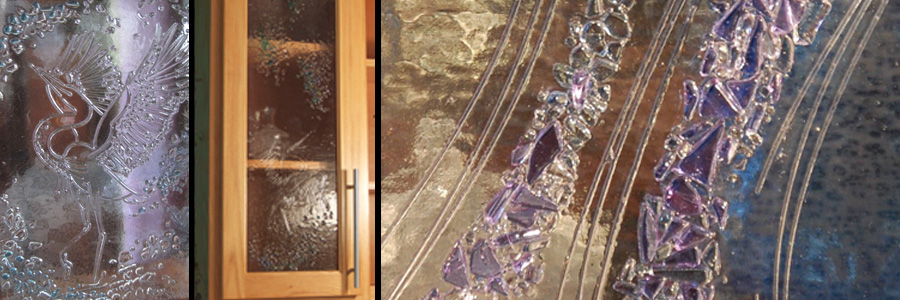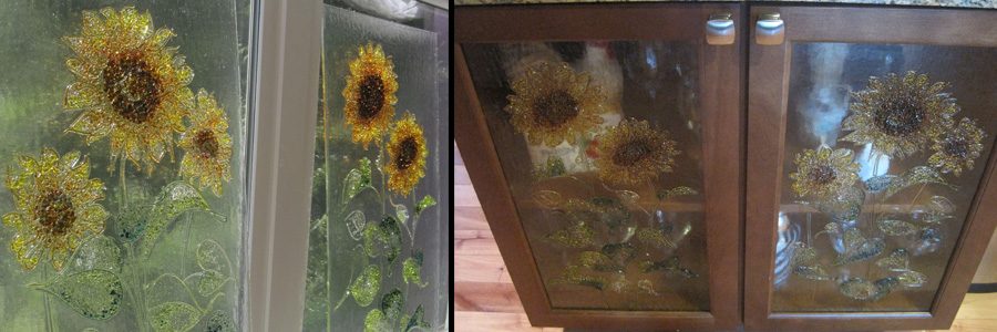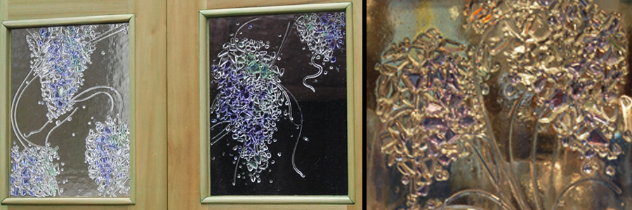 Two years ago while remodeling my own kitchen, I created original glass inserts for my kitchen cabinets. The texture of the glass panels obscures any objects inside of the cabinets, and the light hitting the panels illuminates the entire kitchen. The cabinets glow brightly in both natural and artificial light. I loved the result, and was inspired to share my discovery by creating original glass for all types of kitchen cabinets. I have found that fused glass allows for endless possibilities, much like the traditional stained glass and sandblasted glass techniques I have worked with in the past.